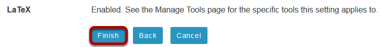 Confirmation screen displays tools for which LaTex has been enabled. Click Finish to confirm.