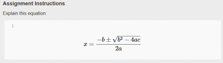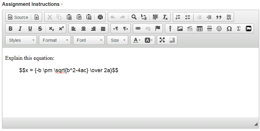 Sakai can display LaTex equations as mathematical notation in most tools. Using LaTex options, instructors and students can simply write LaTex in an enabled tool and the resulting equation will be displayed beautifully.